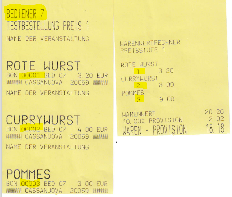 Funktion 118 Testbestellung: Auflisten der verkauften Artikel im Bedienerbetrieb